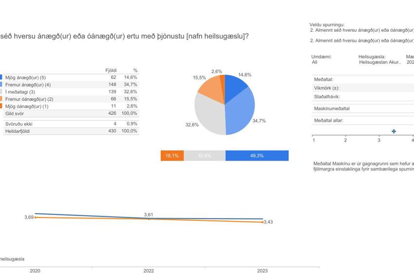 Sé horft á Heilsugæsluna á Akureyri eru einungis 49,3% fremur eða mjög ánægðir árið 2023, þeir voru 62,5% árið 2020. Þeim sem mælast fremur eða mjög óánægðir á sömu heilsugæslustöð fjölgar úr 14,2% árið 2020 í 18,1% að sama skapi 2023. Heilsugæslan raðar sér á tímabilinu 2020 í 27 sæti af 33 mögulegum á landsbyggðinni, 21. sæti árið 2022 og í 25. sæti árið 2023.